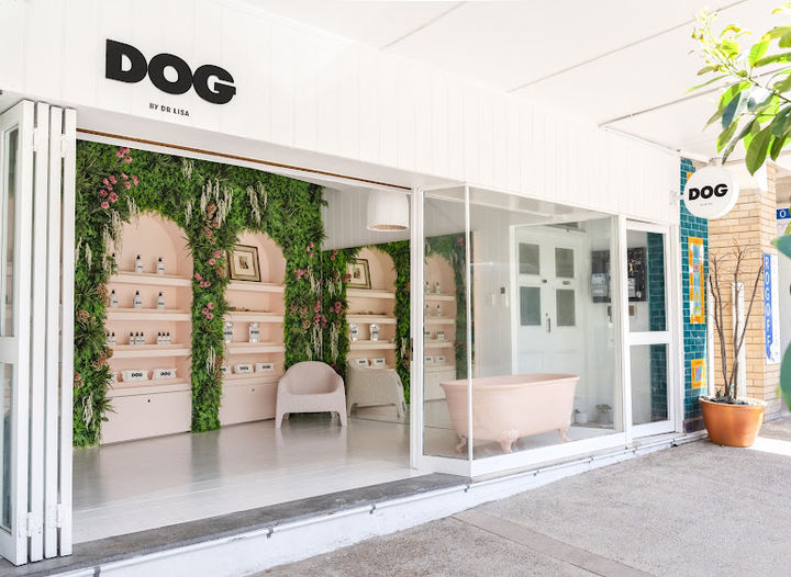 We drew inspiration from the brand identity and incorporated soft peachy pink onto the joinery to contrast against the leafy greens. Boutierre Girls worked their magic creating the lush green wall with pops of pink to tie back into the theme. Plastered dog mannequins, pendant lights and a vintage bath all contribute to the look and aesthetic we wanted to achieve.